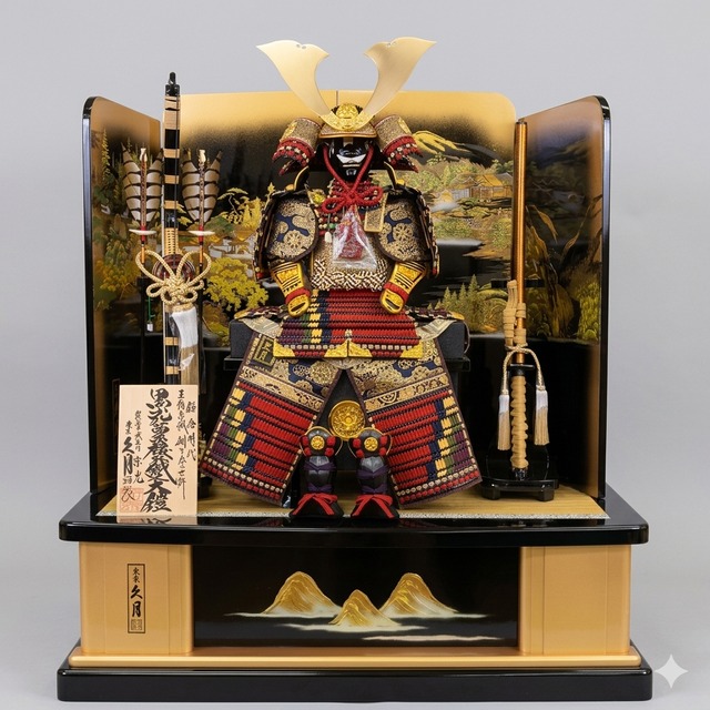 焼桐の収納箱に、龍の屏風のシックでコンパクトな収納飾りです。 人気の伊達の前立ての、小さいながらも本格的な兜です。 サイズ 間口 40㎝ 奥行 30㎝ 高さ 45㎝ ※お手入れセットサービス ※指定日に合わせて発送いたしますので、ご指定がある場合は備考欄に記入お願いいたします。 ※店頭でも同時販売しておりますので、タイミングによっては売り切れの場合もございます。ご了承ください。 ※ご希望により、のし紙をお付けしますので、備考欄に贈り主様のお名前をご記入ください。 ※収納箱の金具部分に家紋をお入れできます。商品に同封の申込書の中からお選びいただけます。なお特注の場合は製作費を別途実費で承ります。 特別な日々の演出や、贈り物としても最適な久月のケース入り兜飾りで、心温まるひとときをお楽しみいただければ幸いです!