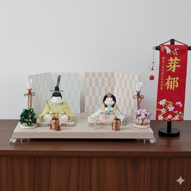 お子様の名前と生年月日を刺繍した「名前旗」です。 雛人形と一緒に飾ってみませんか? 薄桃の糸で、お名前、生年月日を刺繍いたしますので、備考欄に、お子様のお名前(名前のみ)生年月日(和暦)をご記入ください。 ご注文いただいてから製作いたしますので、2週間ほどお時間がかかります。 到着日の指定がある場合も、備考欄にご記入ください。 受注生産のため、キャンセルは注文日当日まで。それ以降のチャンセルはお受できませんので、ご注意ください。 間口 18㎝ 奥行 8㎝ 高さ 38㎝