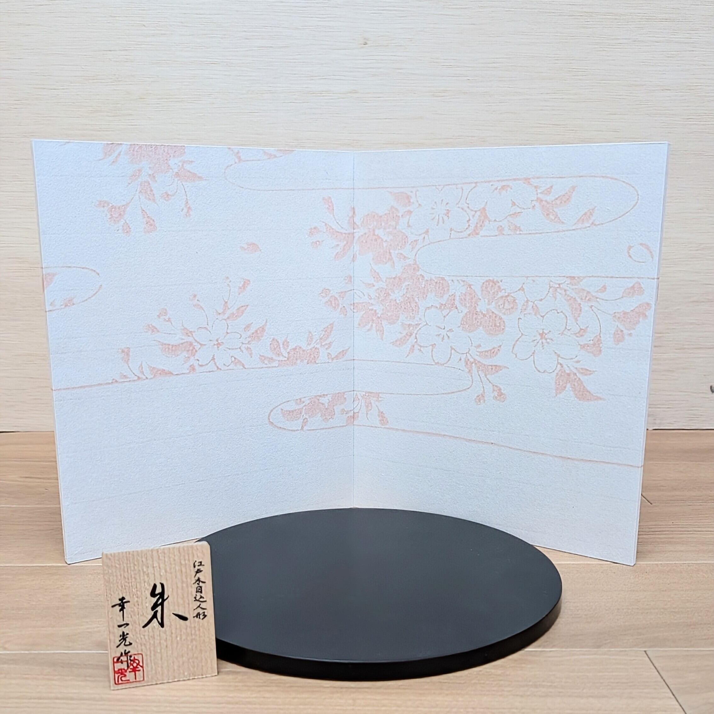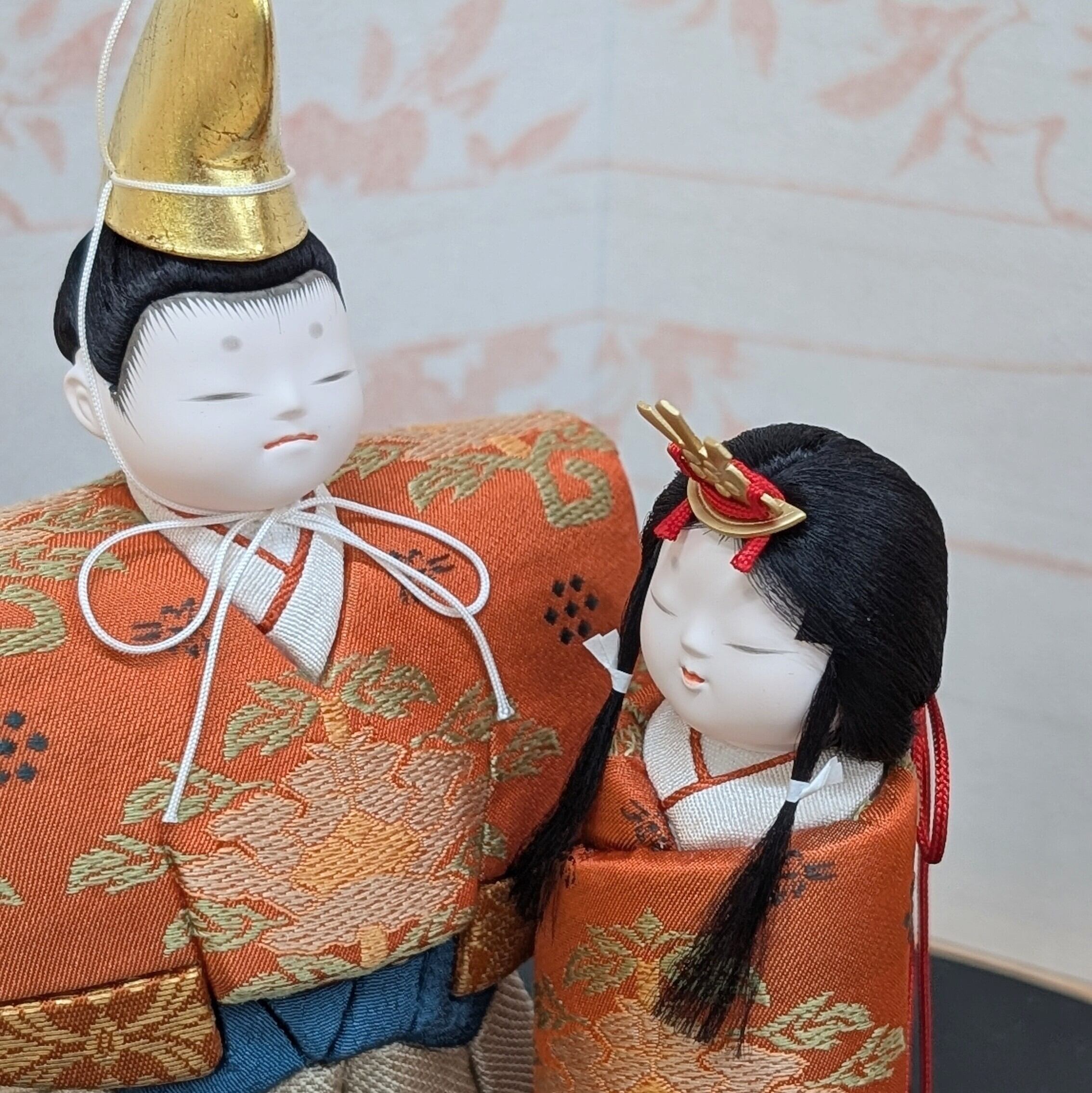 美しい木目込み技術が施されお人形は、優しさと凛々しさを兼ね備えた表情が魅力的です。鮮やかな朱色の衣装は、華やかさを引き立て、特別なひな祭りの雰囲気を演出します。柔らかな風合いの桜の描かれた屏風がより一層お祝いの場を華やかに彩ります。
