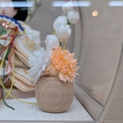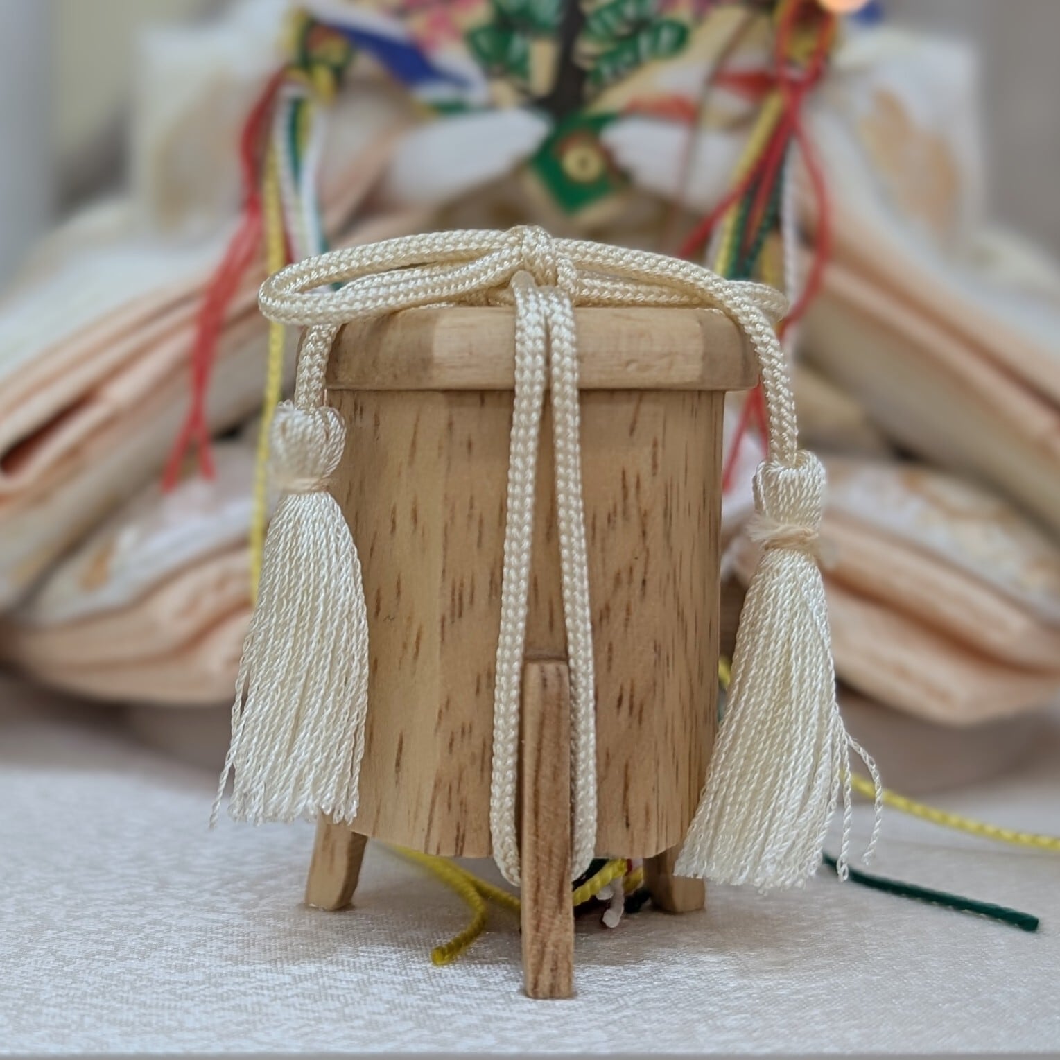 お道具は行器(ほかい)とお花も、ケースに木製で揃えました。