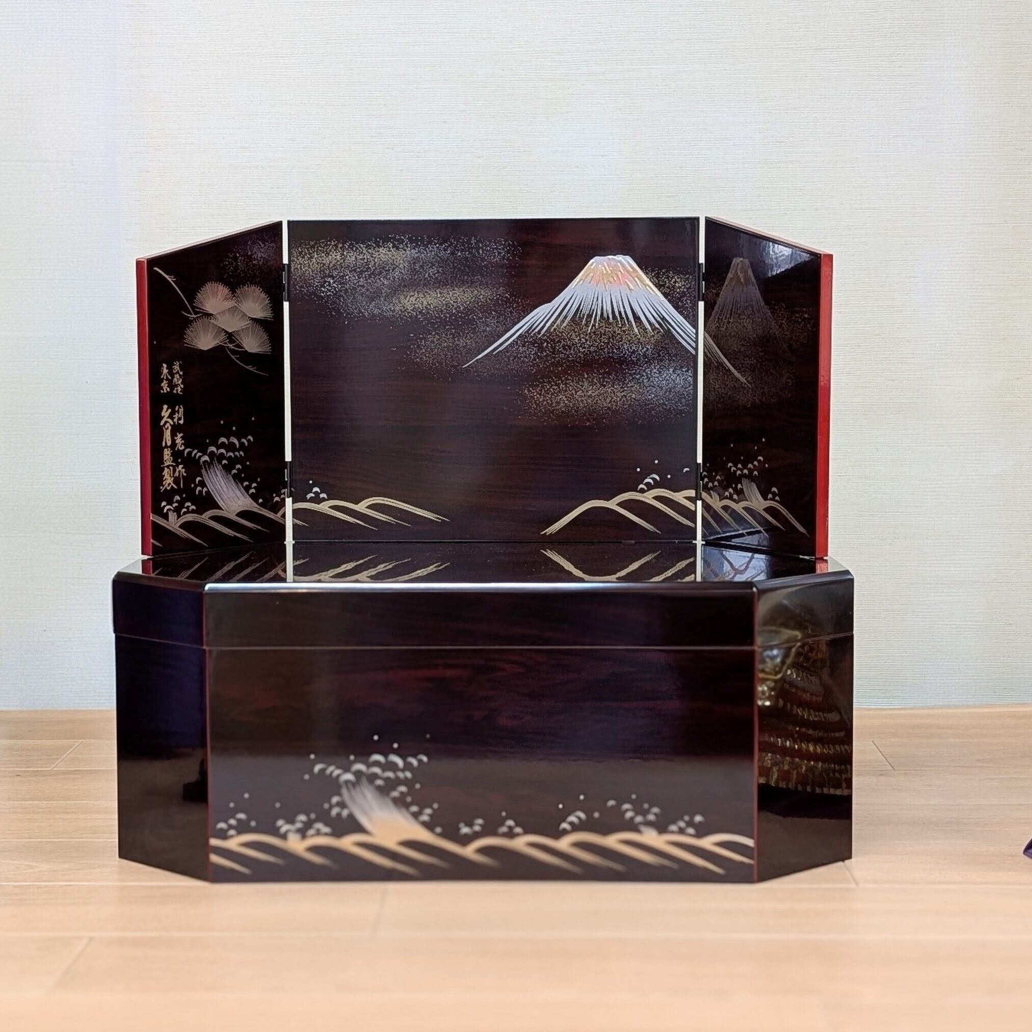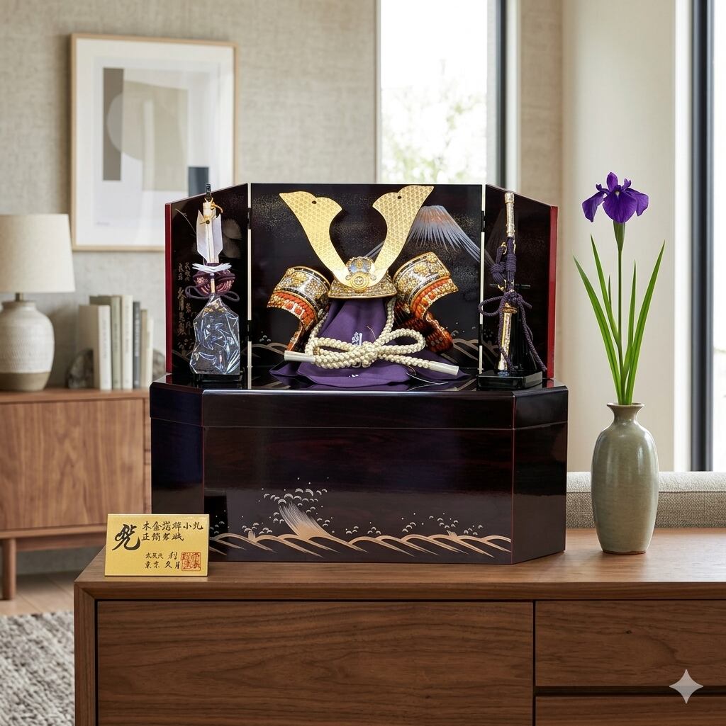 伝統工芸士・鈴木利光が丁寧に手作業で仕立てた美しい兜が、富士と波を描いた高級感のある飾り台と屏風に見事に映えます。