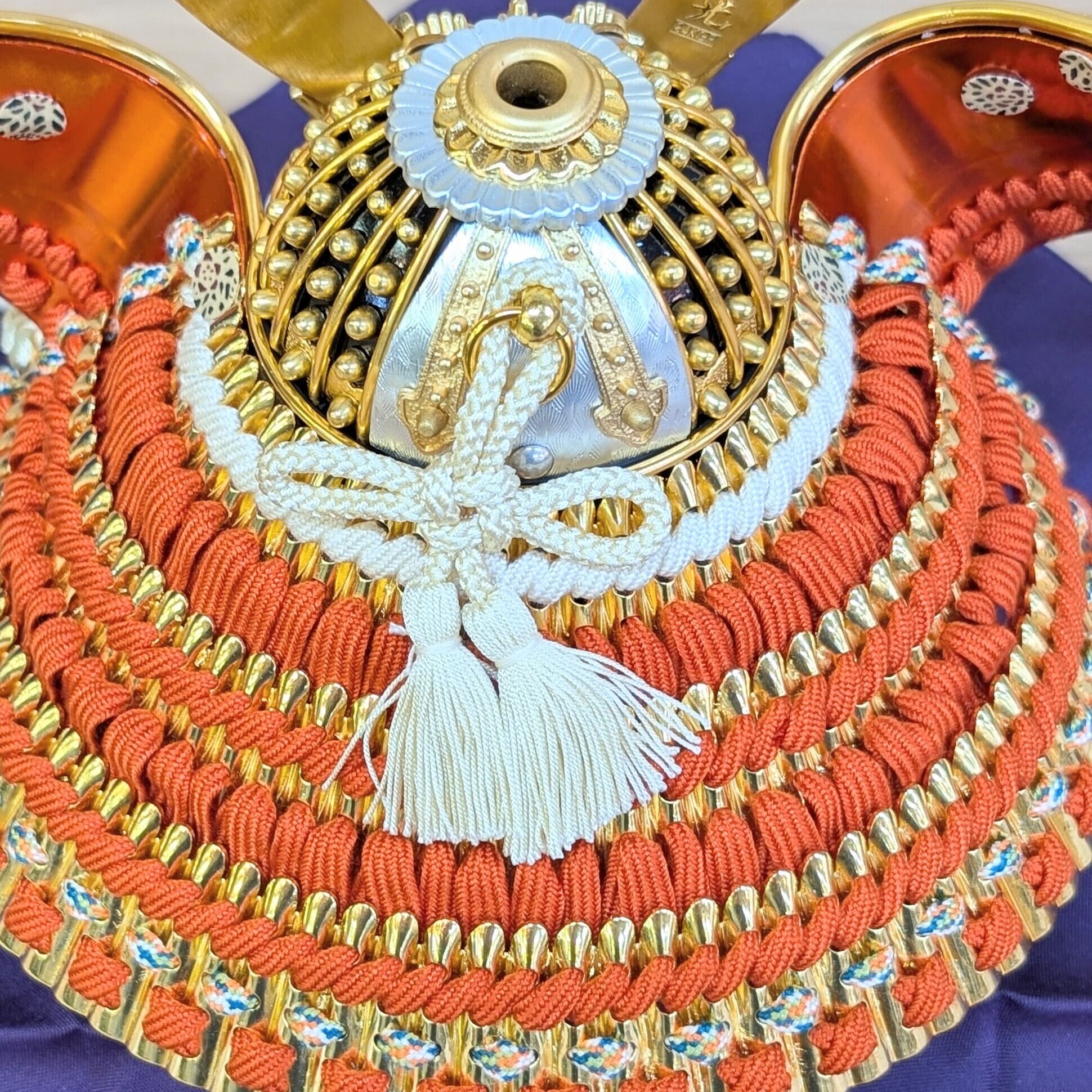 上品な正絹の朱肩白縅(しゅかたじろおどし)で仕上げた兜は、本金箔押を施して完成させる豪華な小札(こざね)造りや、本金鍍金を施した勇壮な鍬形など、鈴木利光の技術の高さを感じさせる丁寧な仕立てが魅力です。