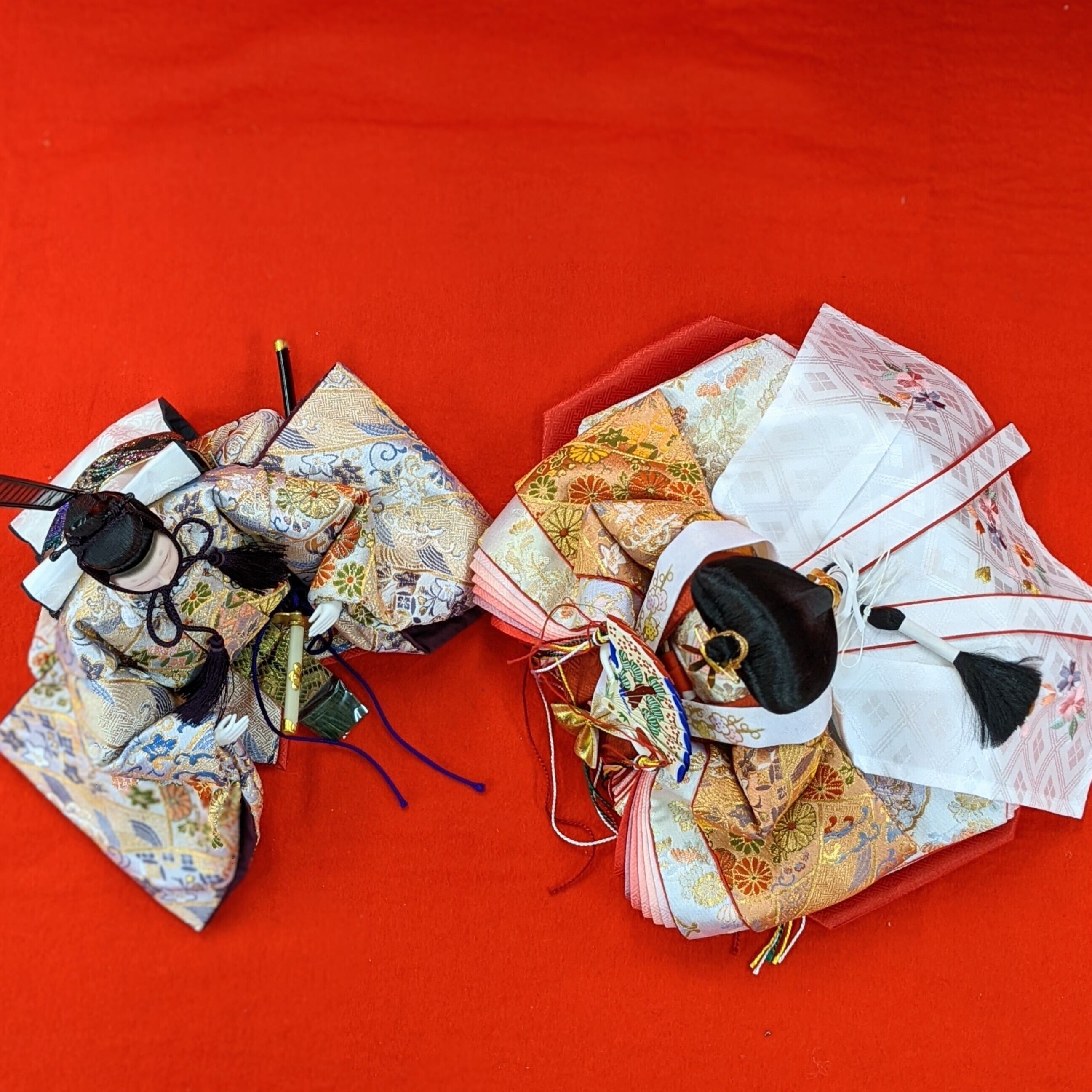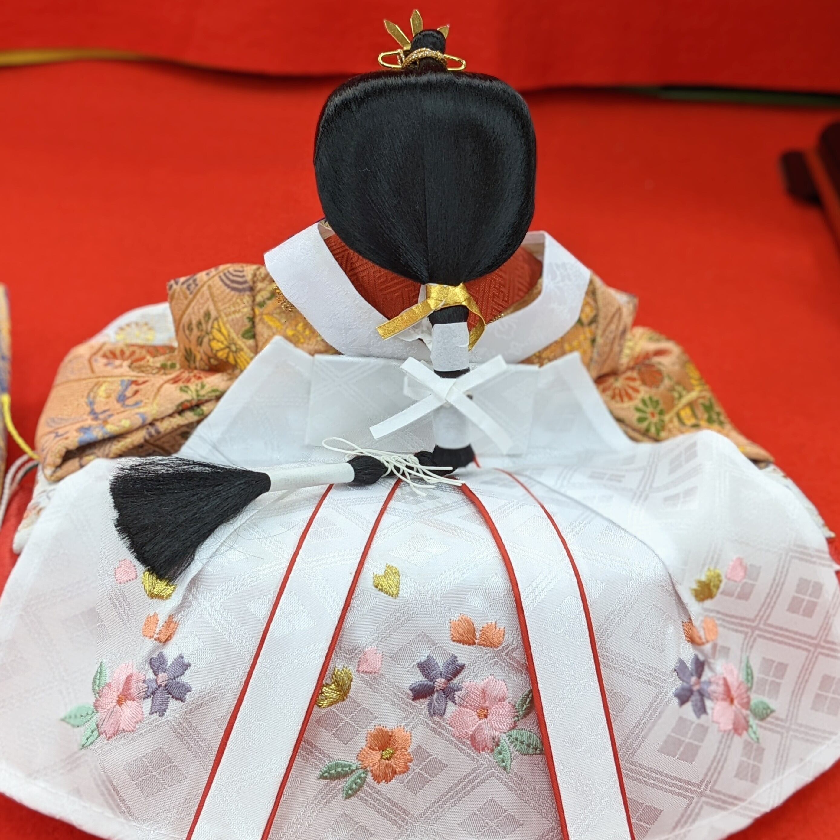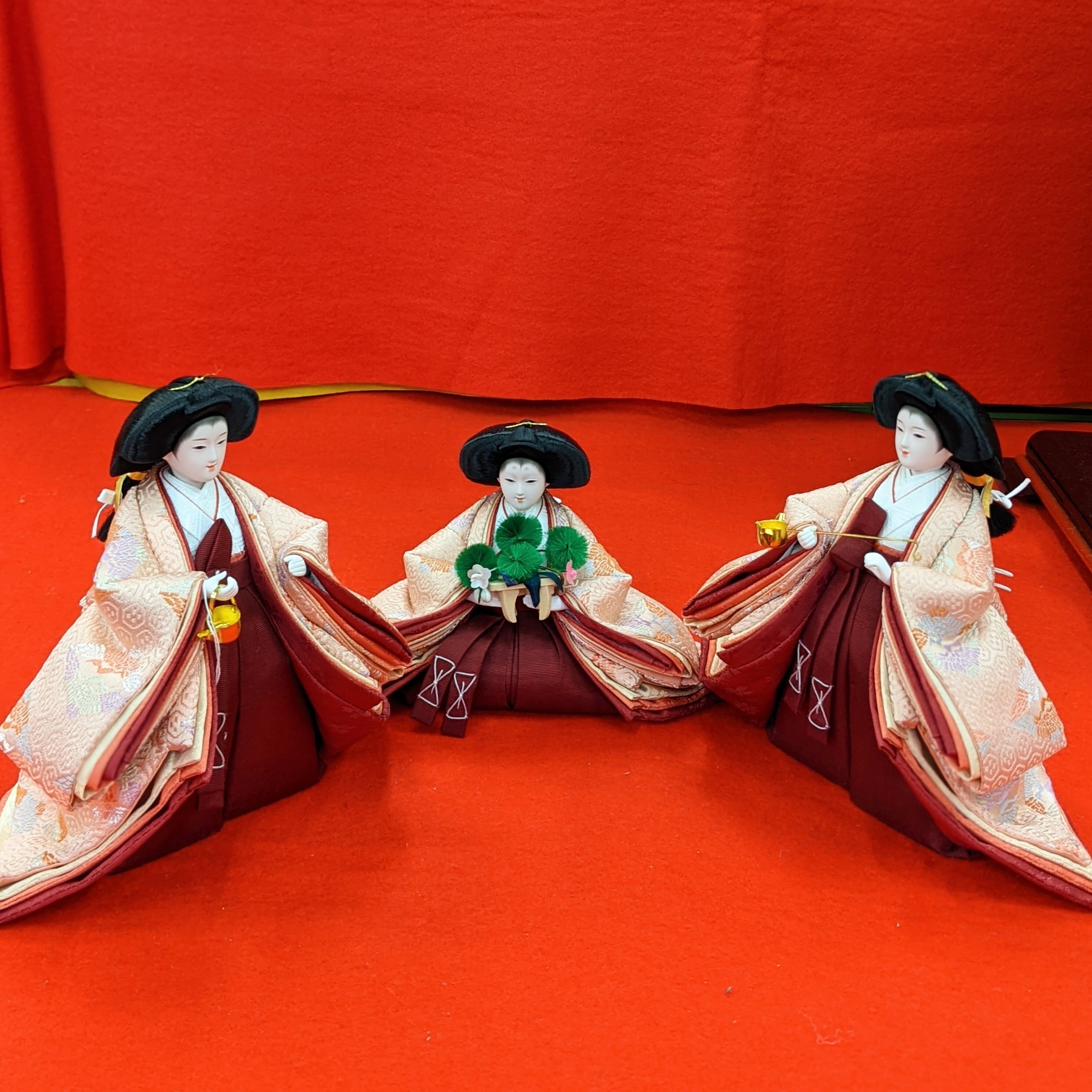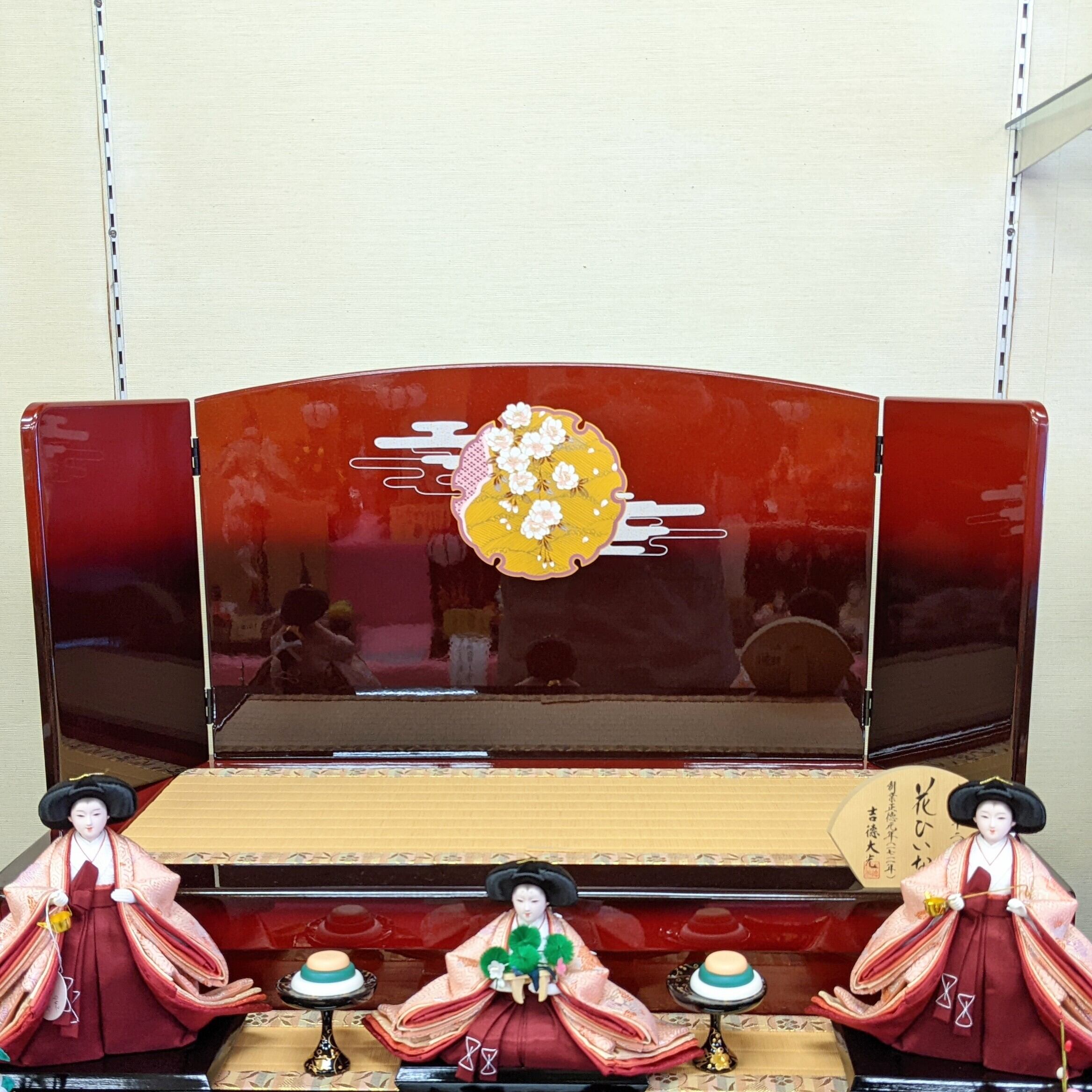 茜色暈しの屏風にお人形の衣装が映え、印象深い一揃えになりました。