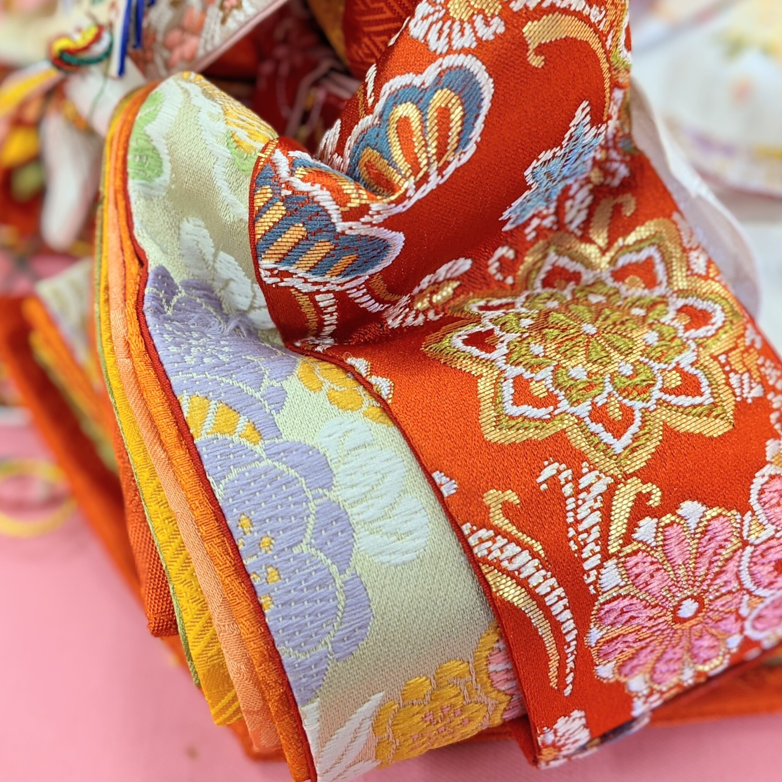 可愛らしい毬の刺繍が施されたピンクの屏風に