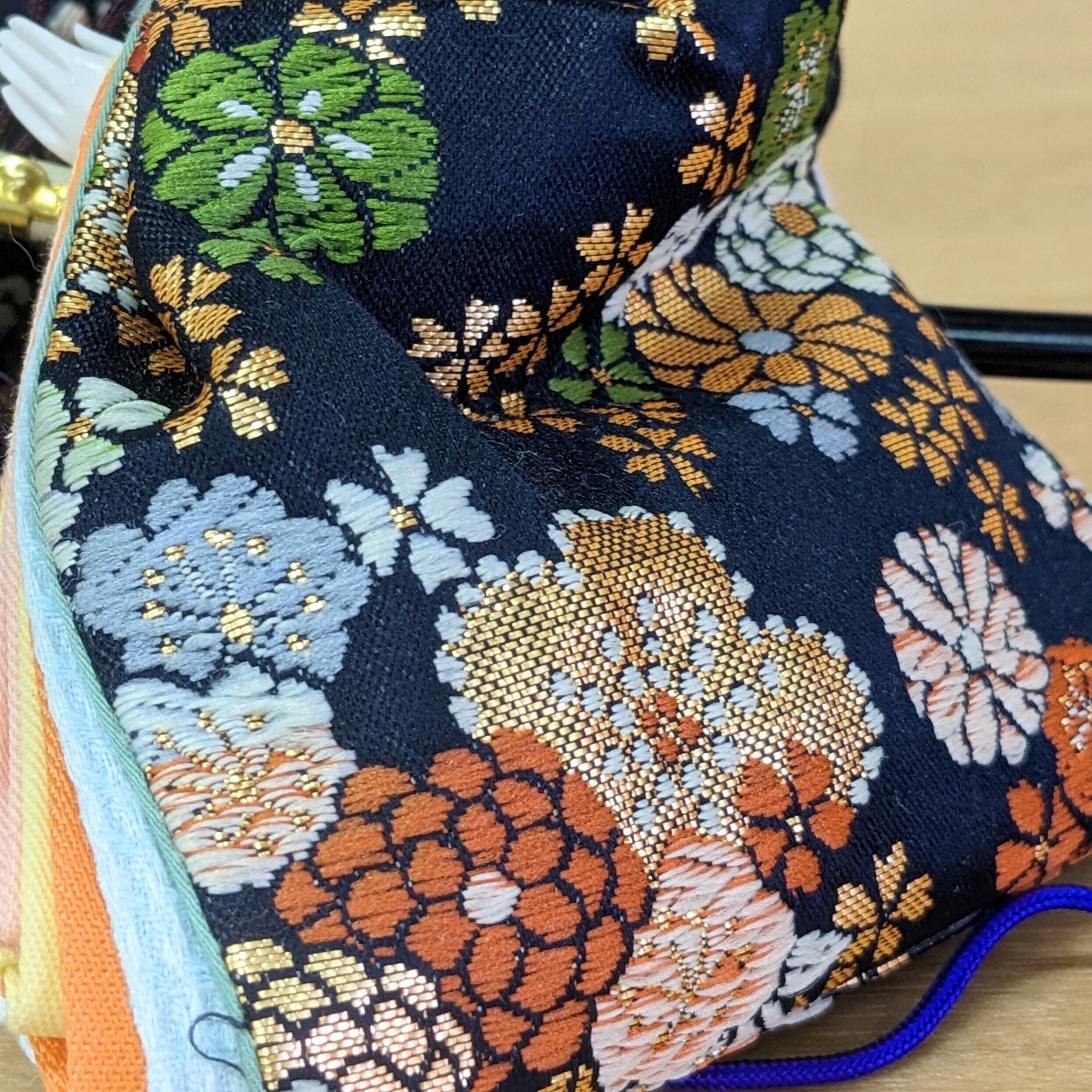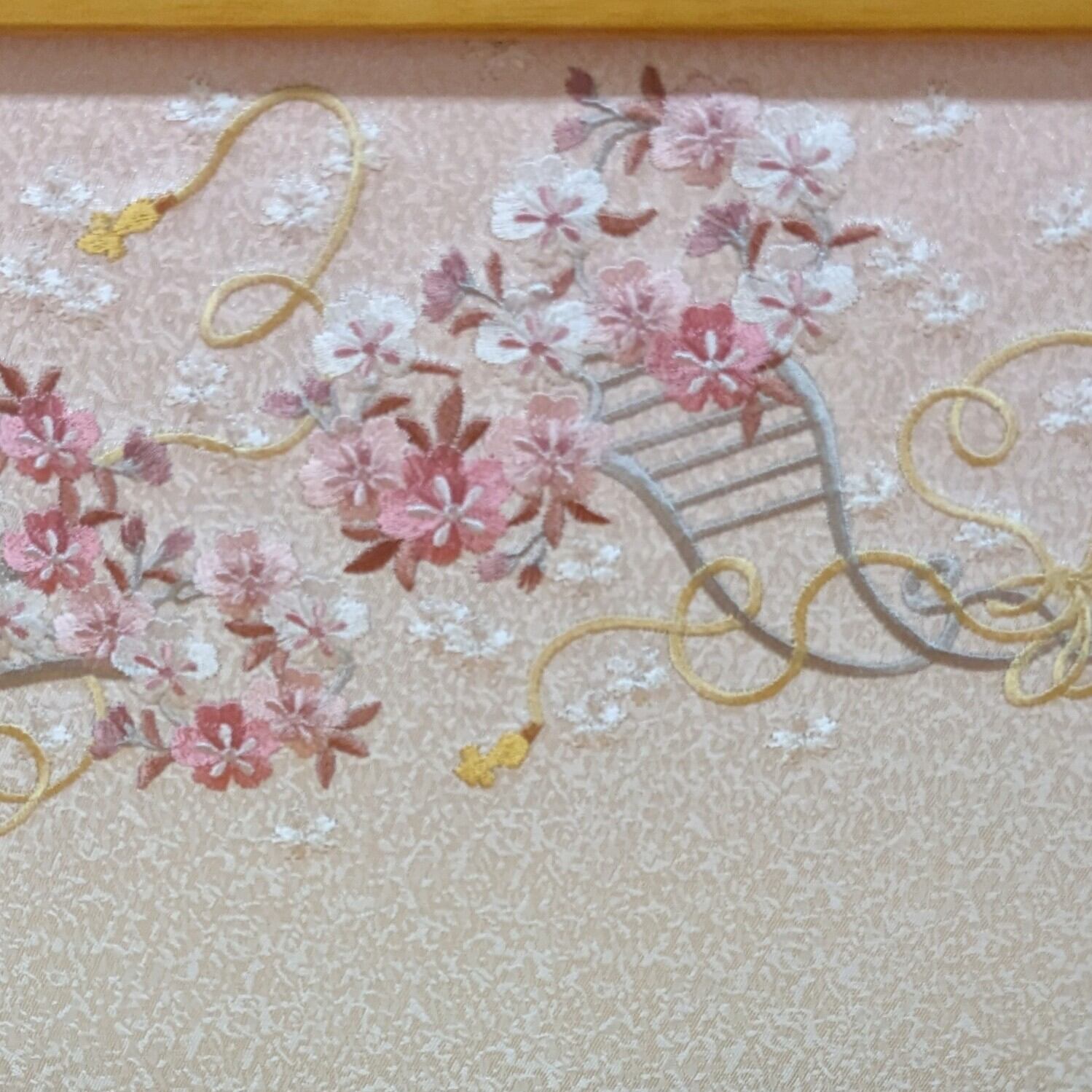 衣装は金糸を使用した、華やかな花模様。台屛風は白木の木目調で桜の刺繍が明るい雰囲気です。