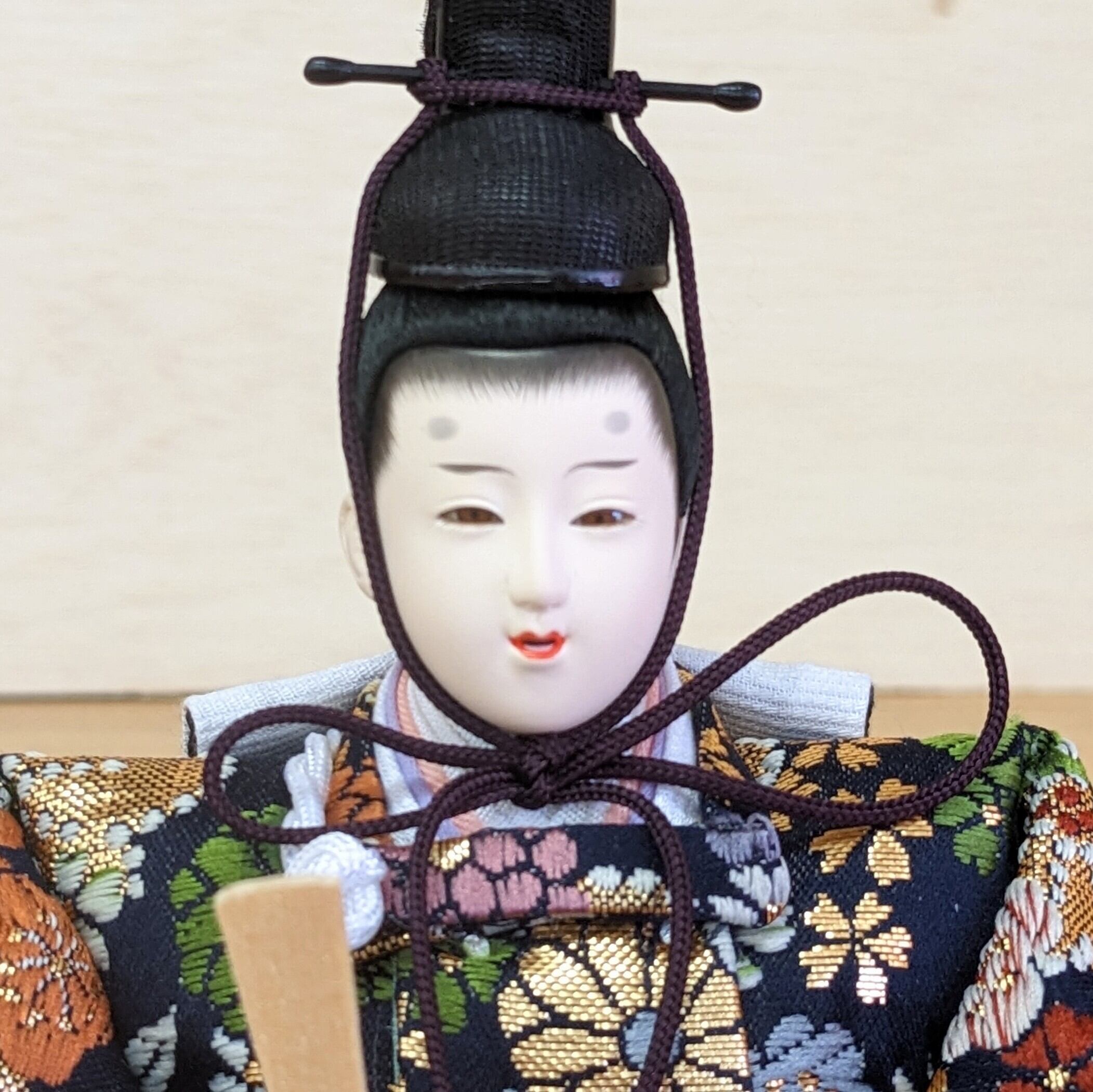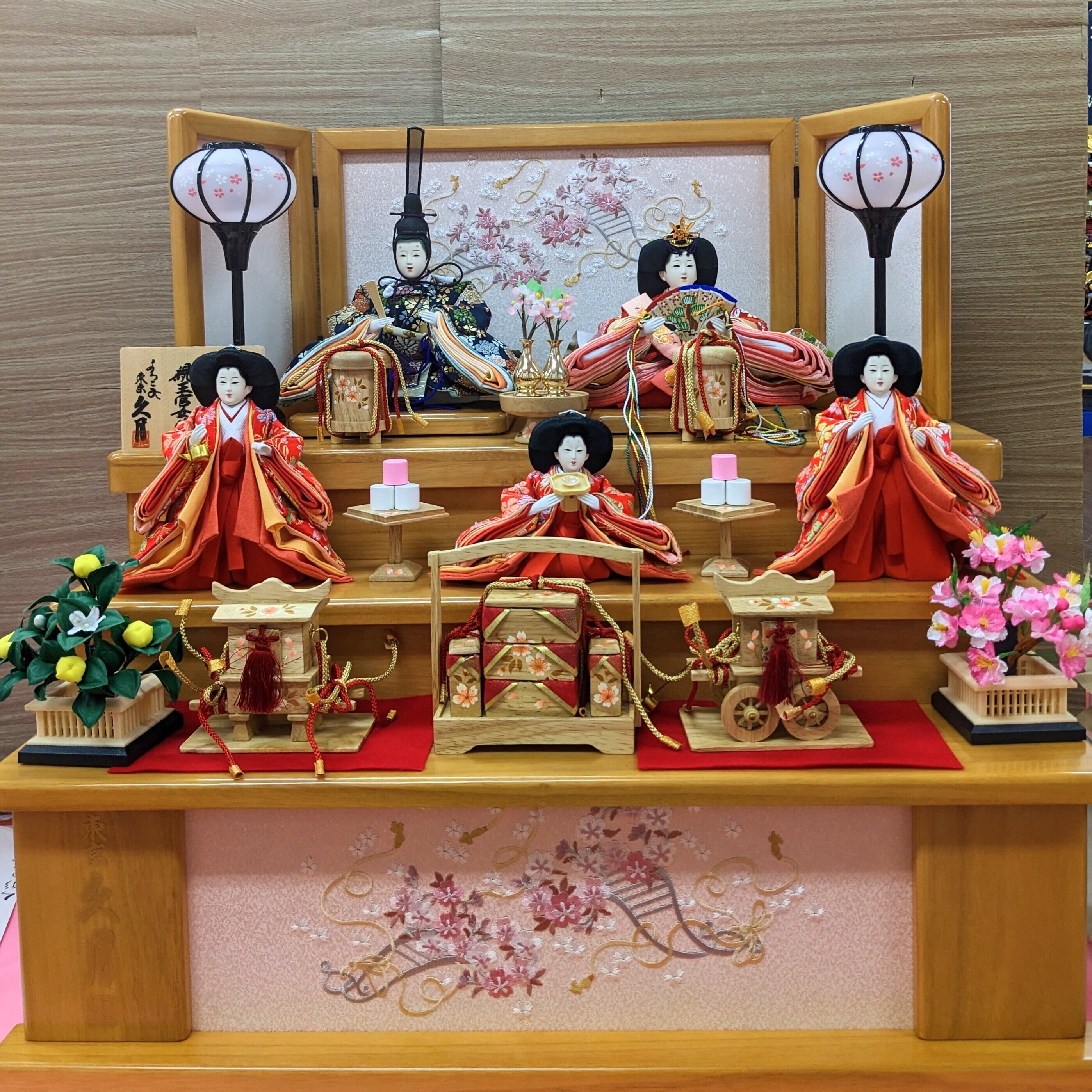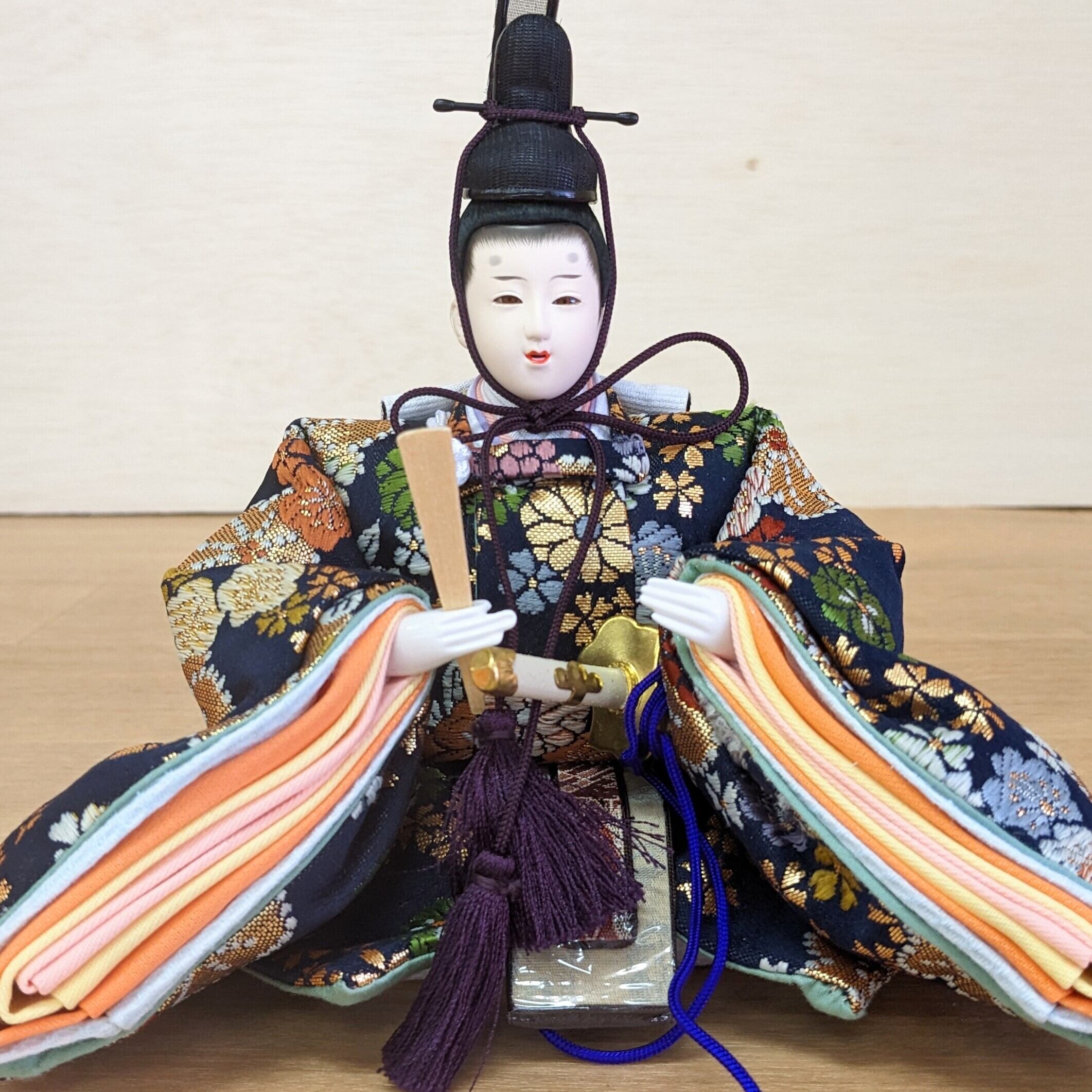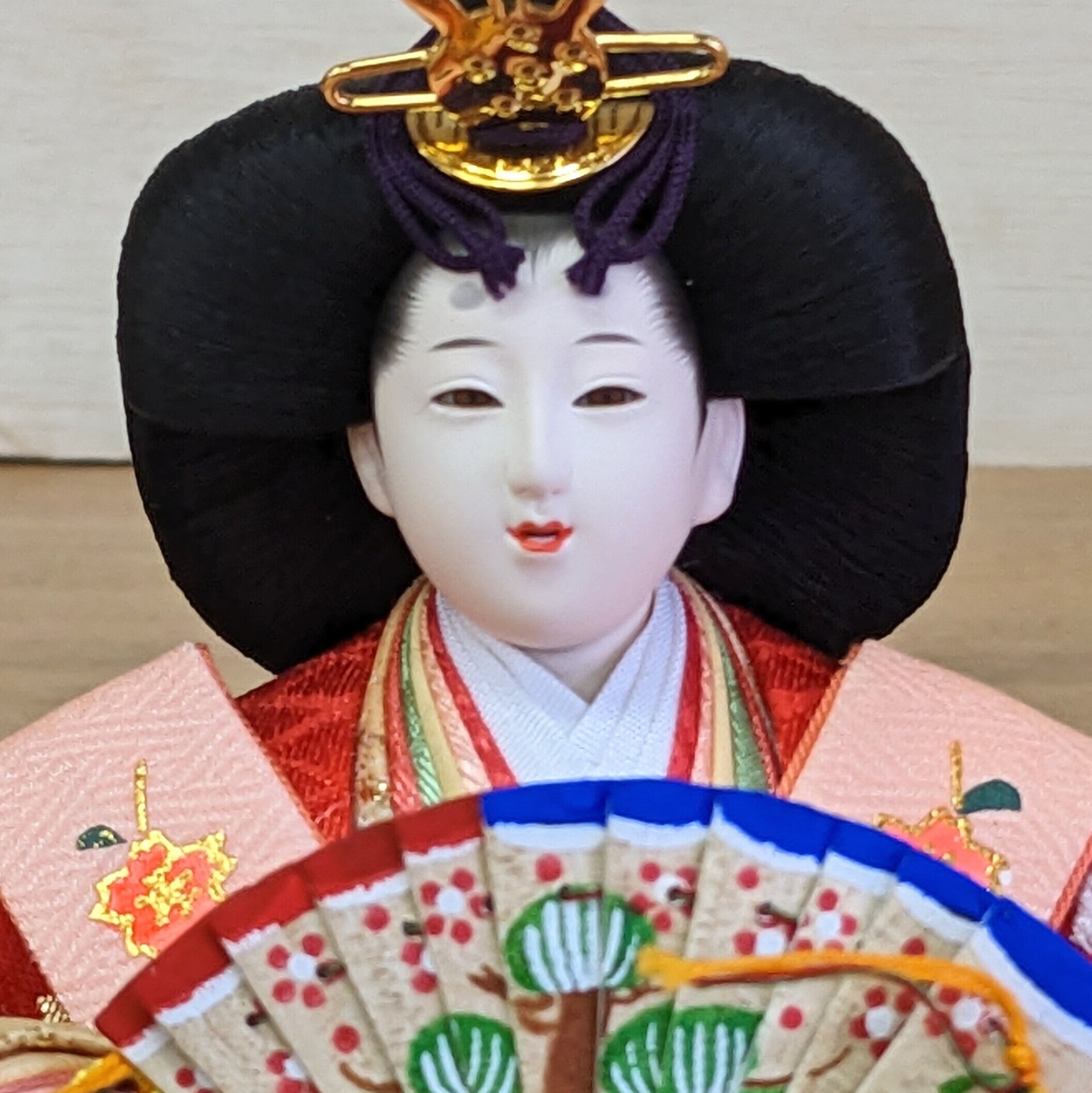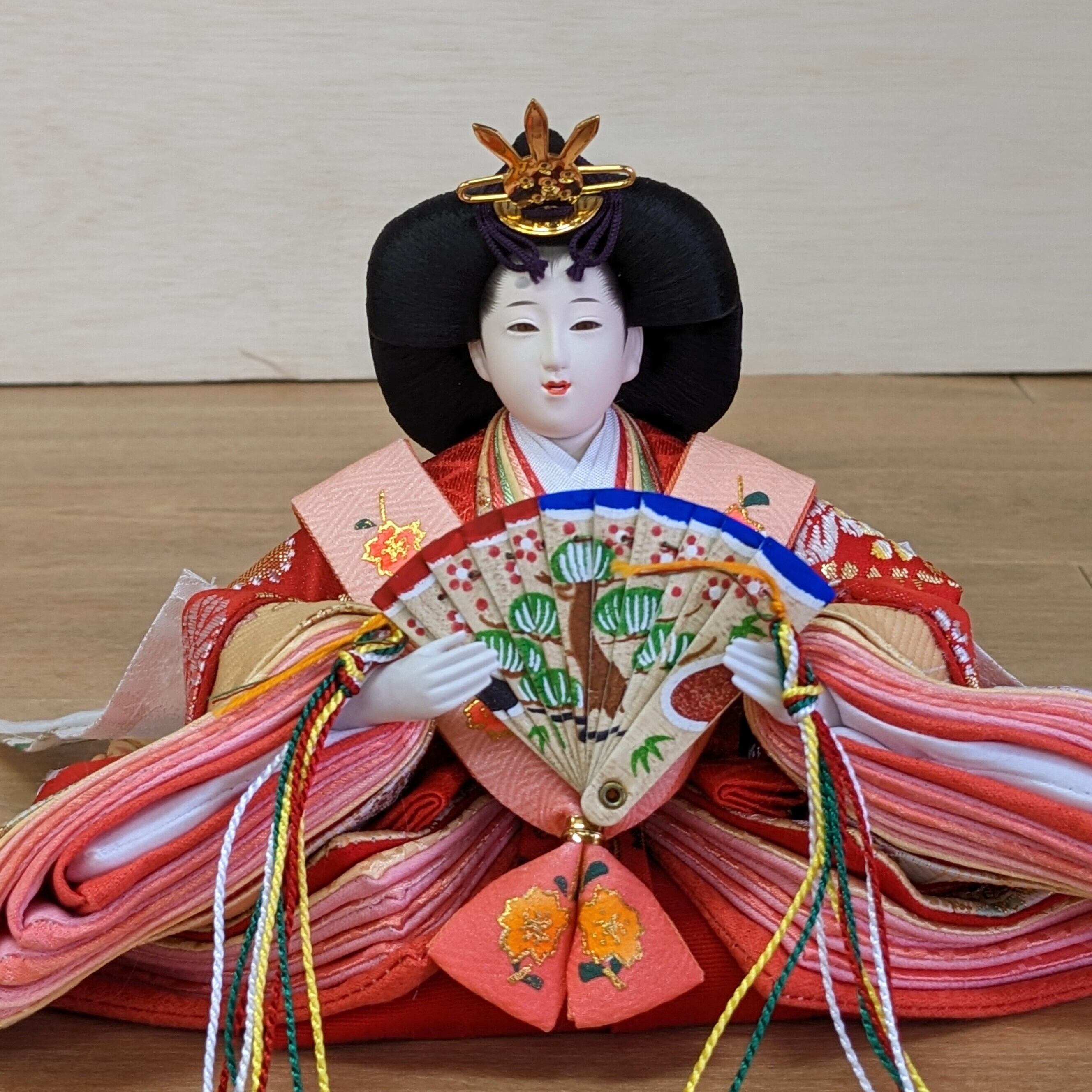 収納箱に、後ろの扉からお人形、お道具をしまえるタイプの雛飾りです。