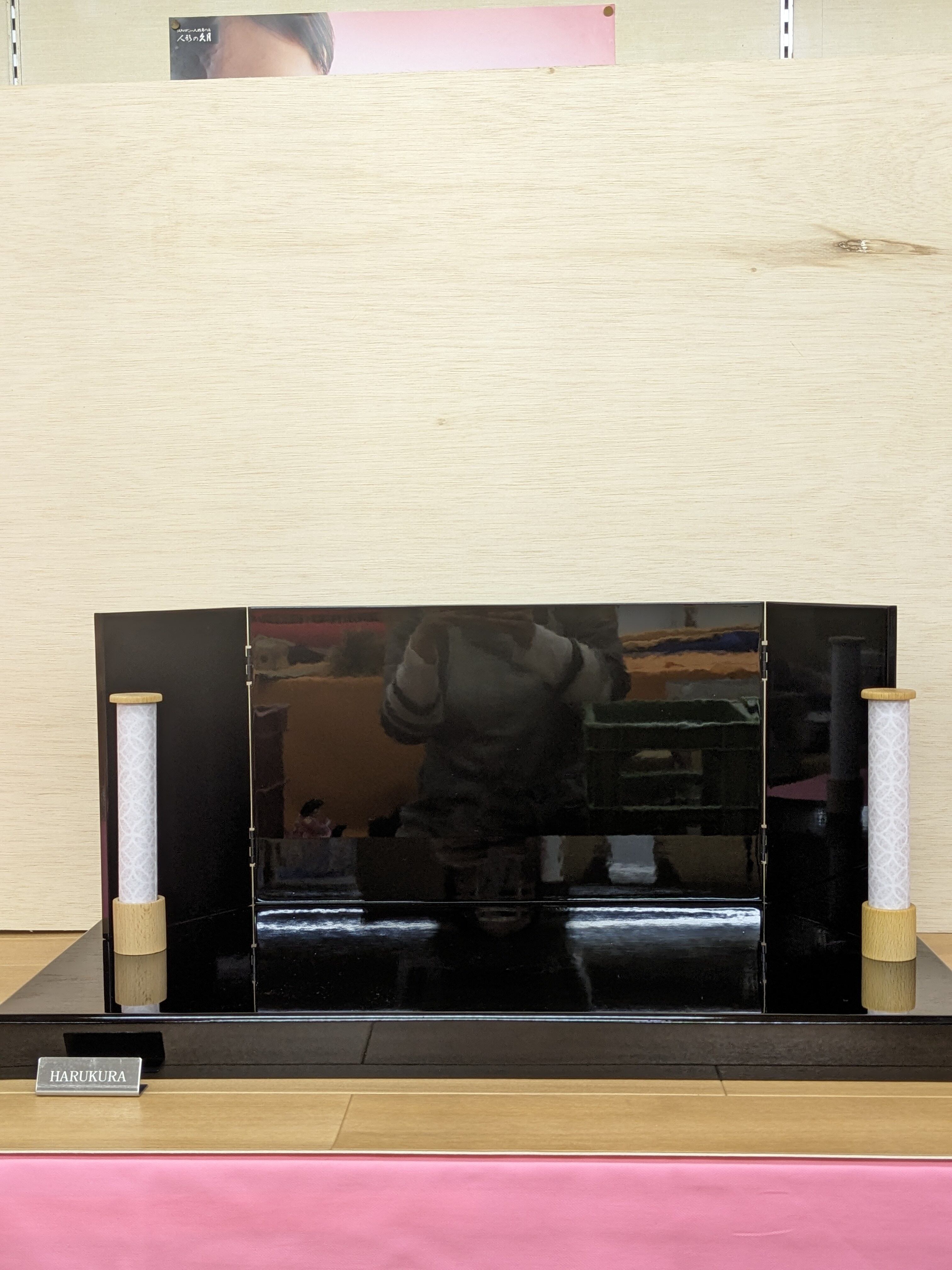 シンプルな黒塗りの台屏風によく映え、洋間になじむデザインです。