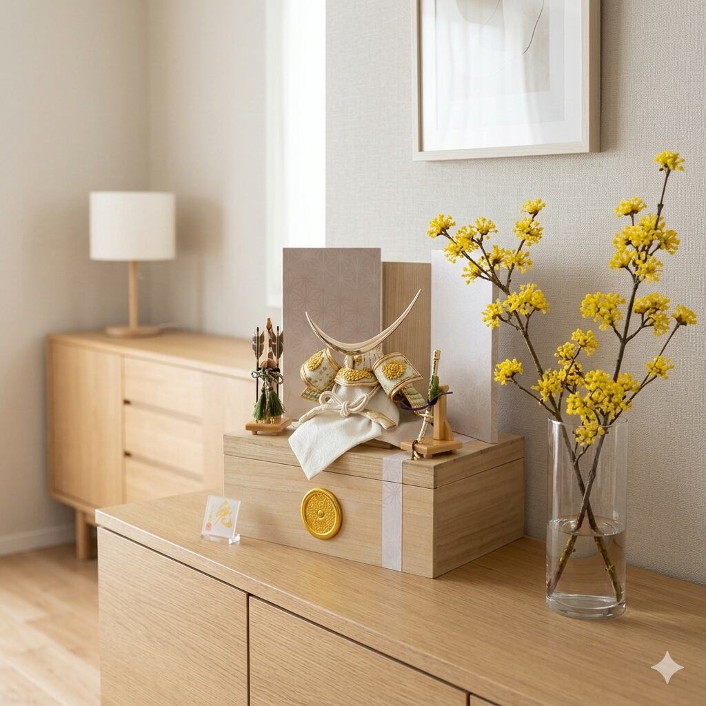 飾る場所を選ばないコンパクトなサイズ感も魅力の、フローリングのお部屋にも違和感無くマッチする兜収納飾りです。