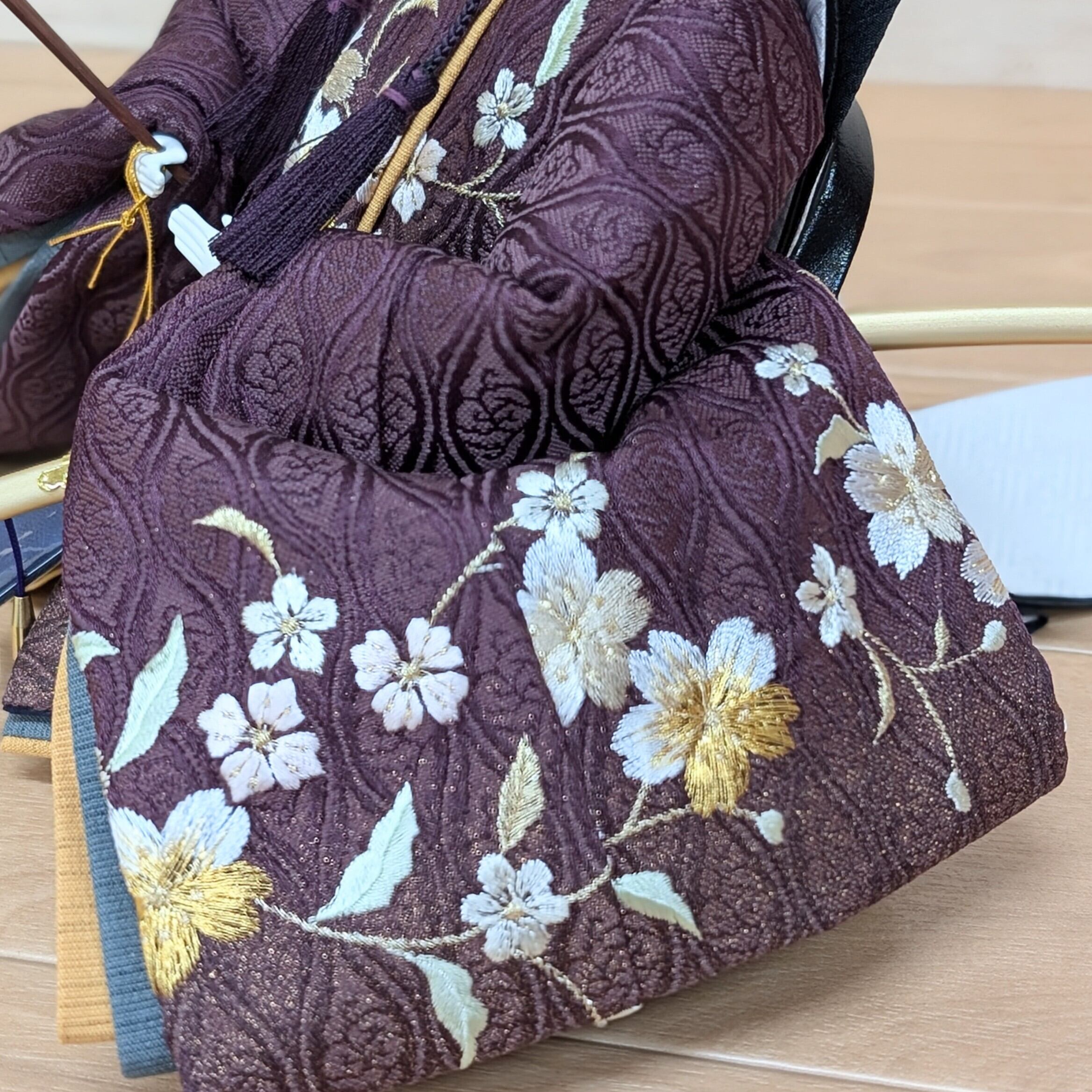 お人形は有職文様衣装に刺繍をほどこした重厚な衣装が特徴的です。豪華絢爛な袖と多彩な色目の五衣の着付けはこだわりの技術の結晶です。の金糸をふんだんに使った古典柄の金襴を使用し、華やかな印象です。