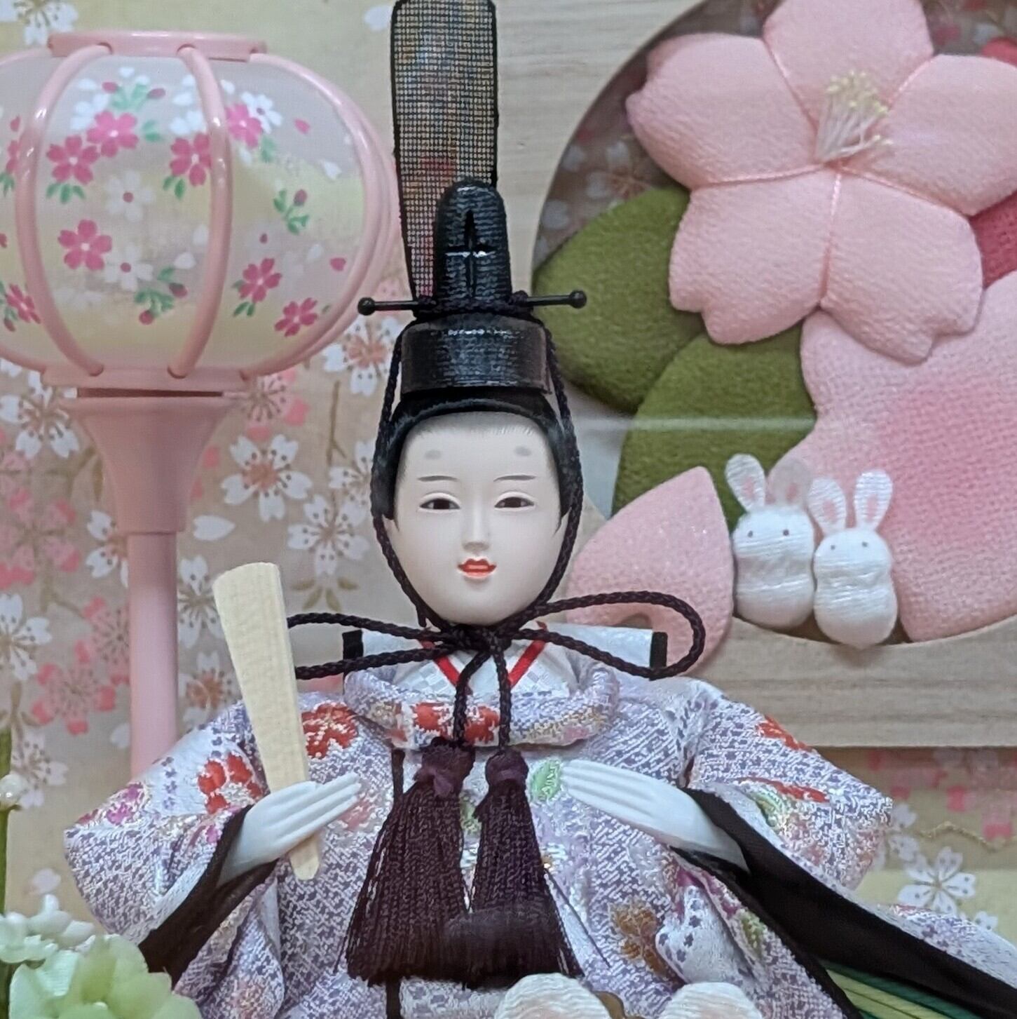 明るいピンクのケースに、バックにちりめんの桜 ウサギの三人官女のかわいらしいセットです。