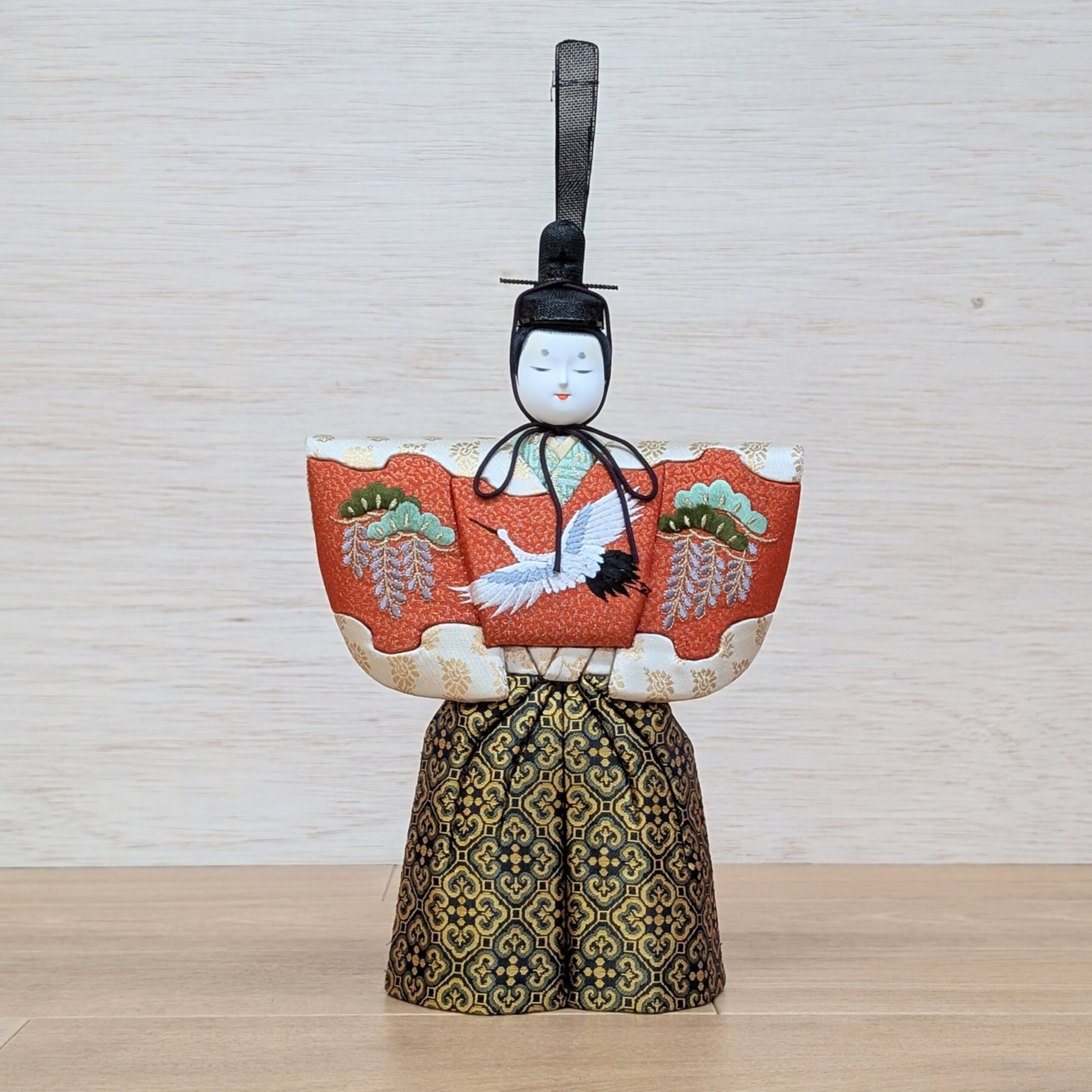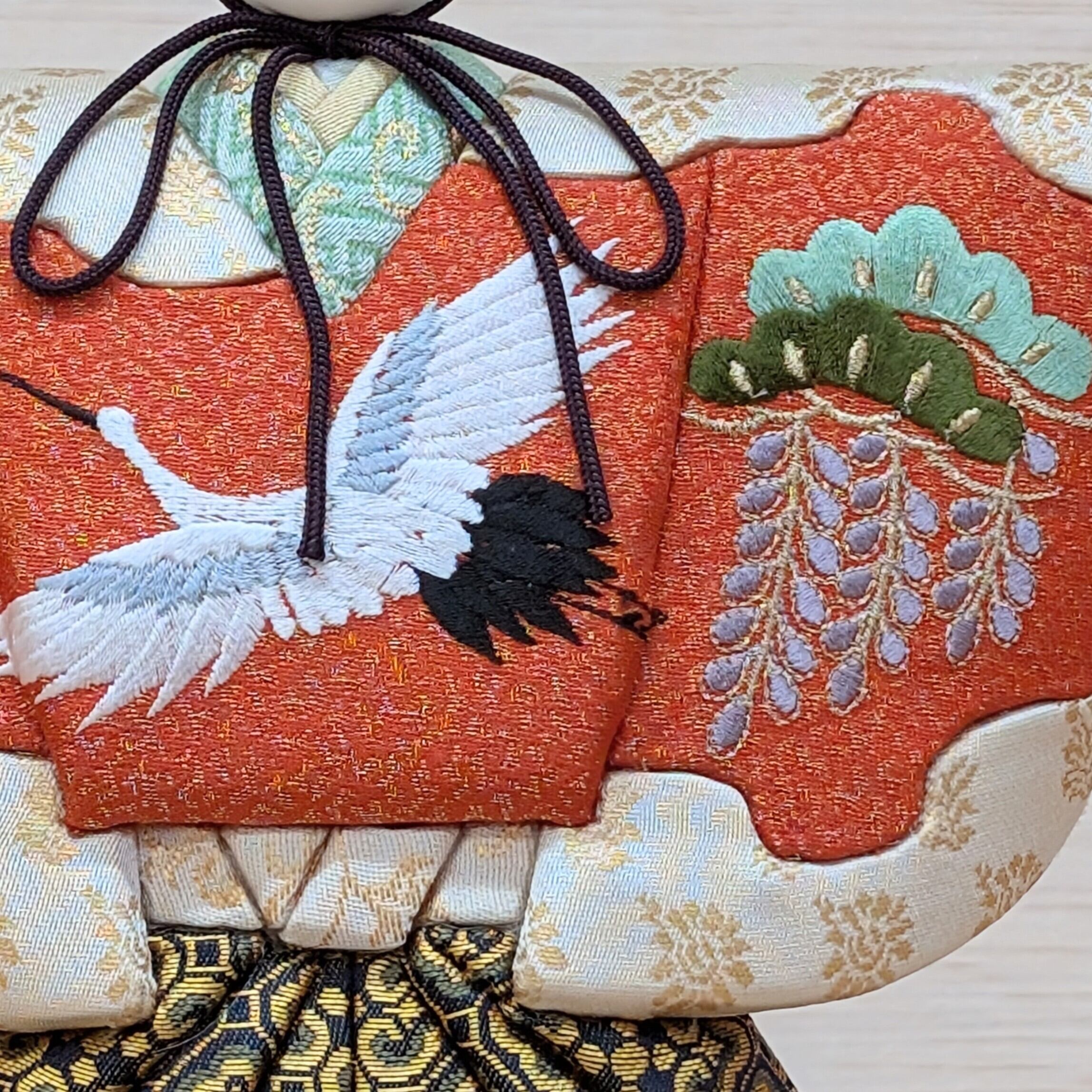 衣裳には縁起の良い鶴と亀を豪華な刺繍であしらった、末永く健康にとの願いを込めたおひなさまです。