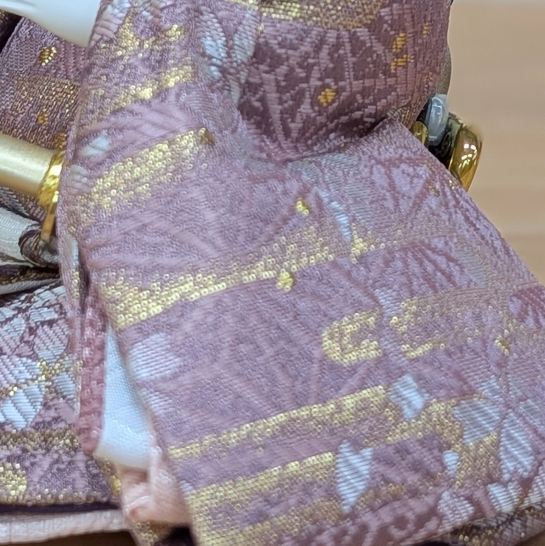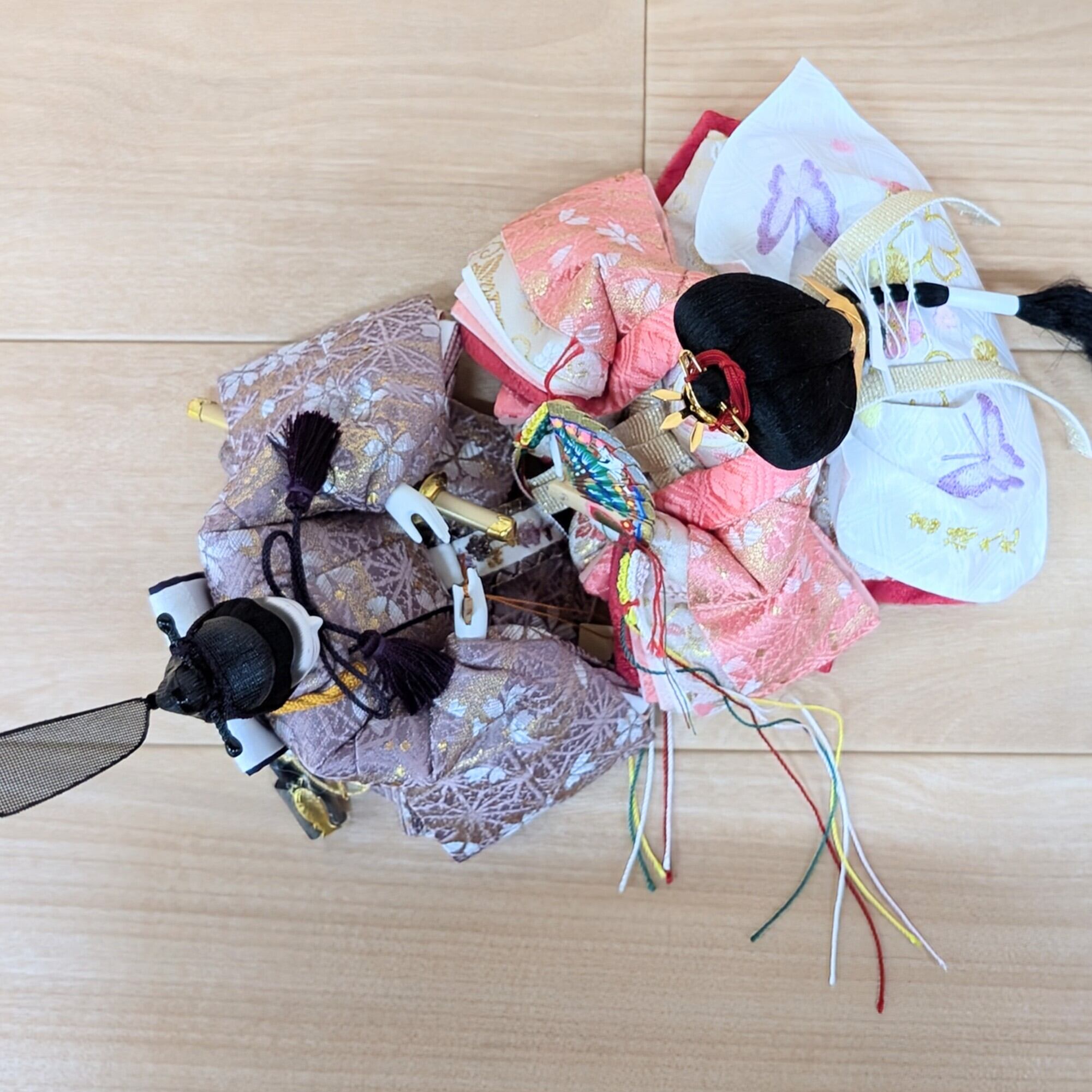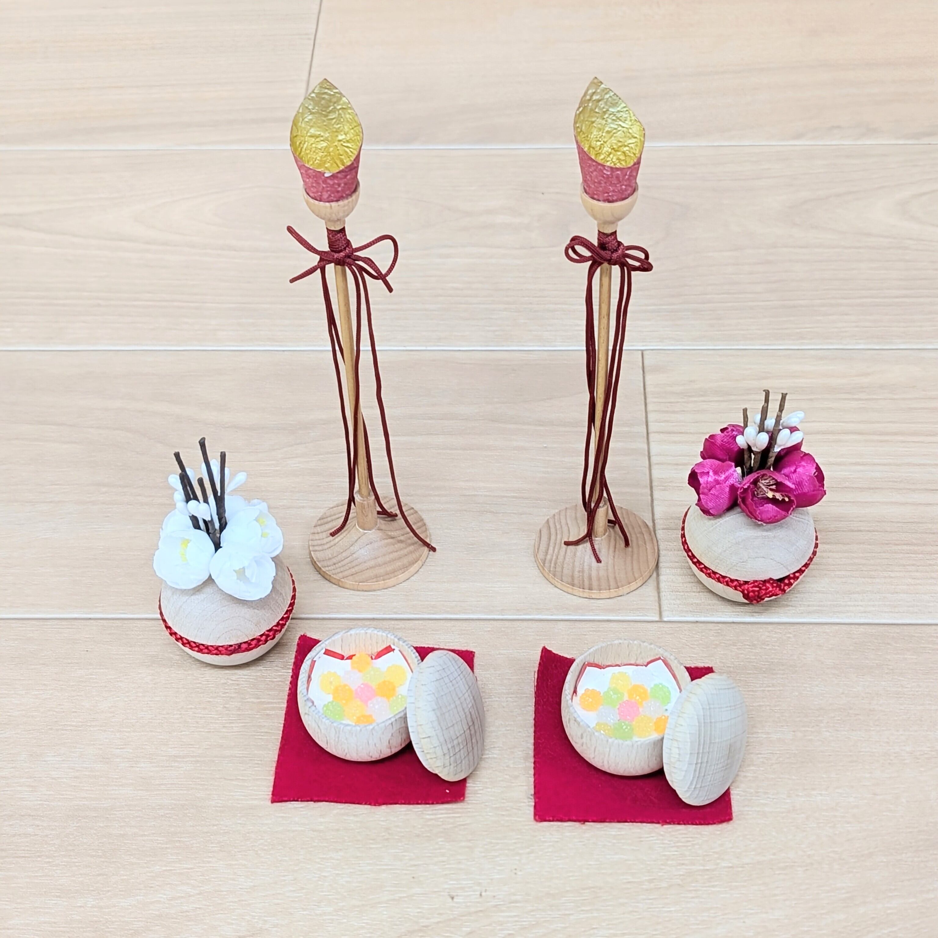 衣装は優しい色あいの衣装のお人形と、シックな台、屏風。お道具は、白木のかわいらしいボンボニエール(金平糖入れ)です。